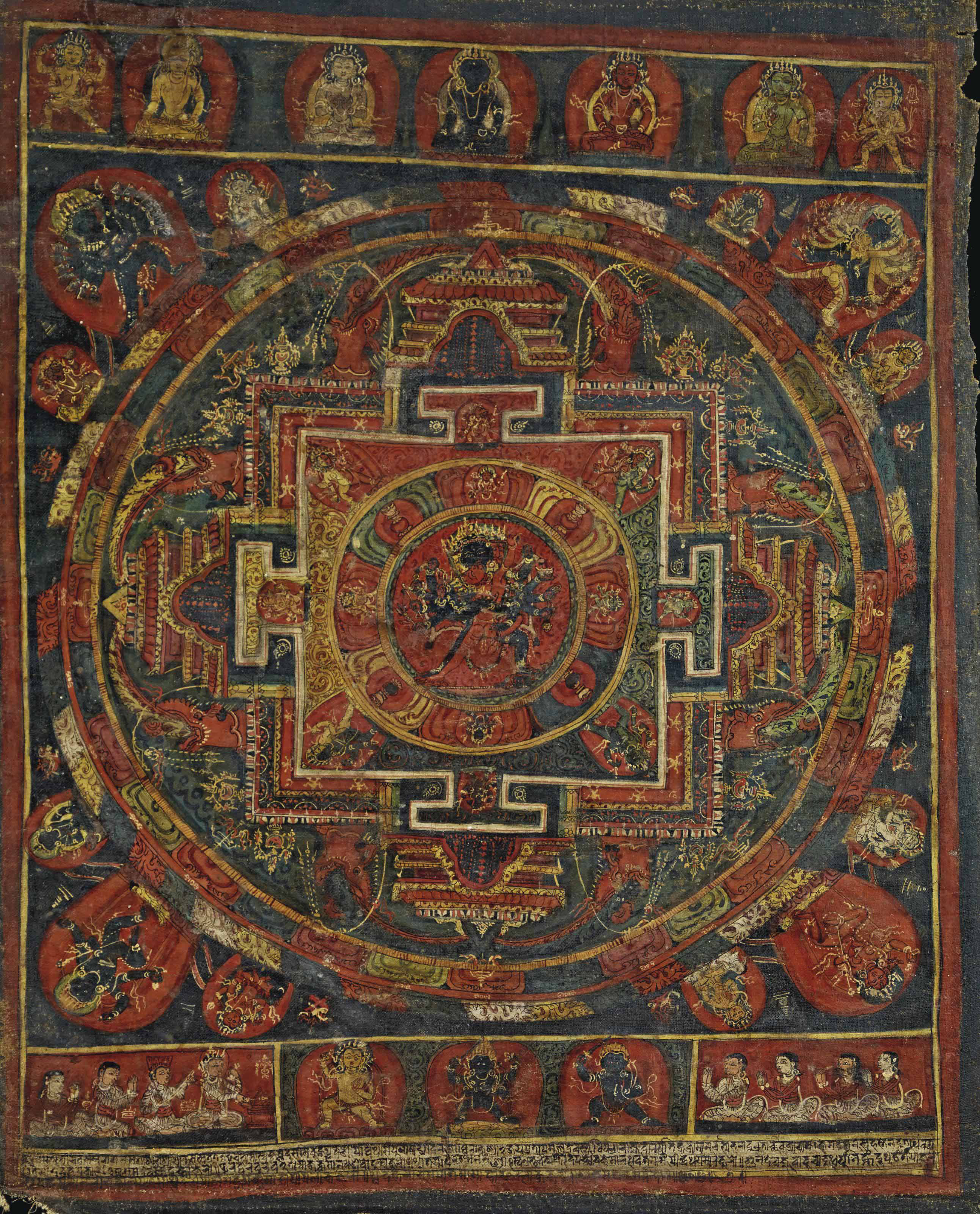 He represents Cakrasamvara in the centre of the mandala. He is surrounded by other deities figured on the petals of a lotus inside a palace. The latter is surrounded by friezes of petals and flames. The corners are enhanced with protective deities. The upper part is embellished with five Taras flanked by two deities. The lower part is decorated with various deities flanked by two scenes of offering, above an inscription in Newari.