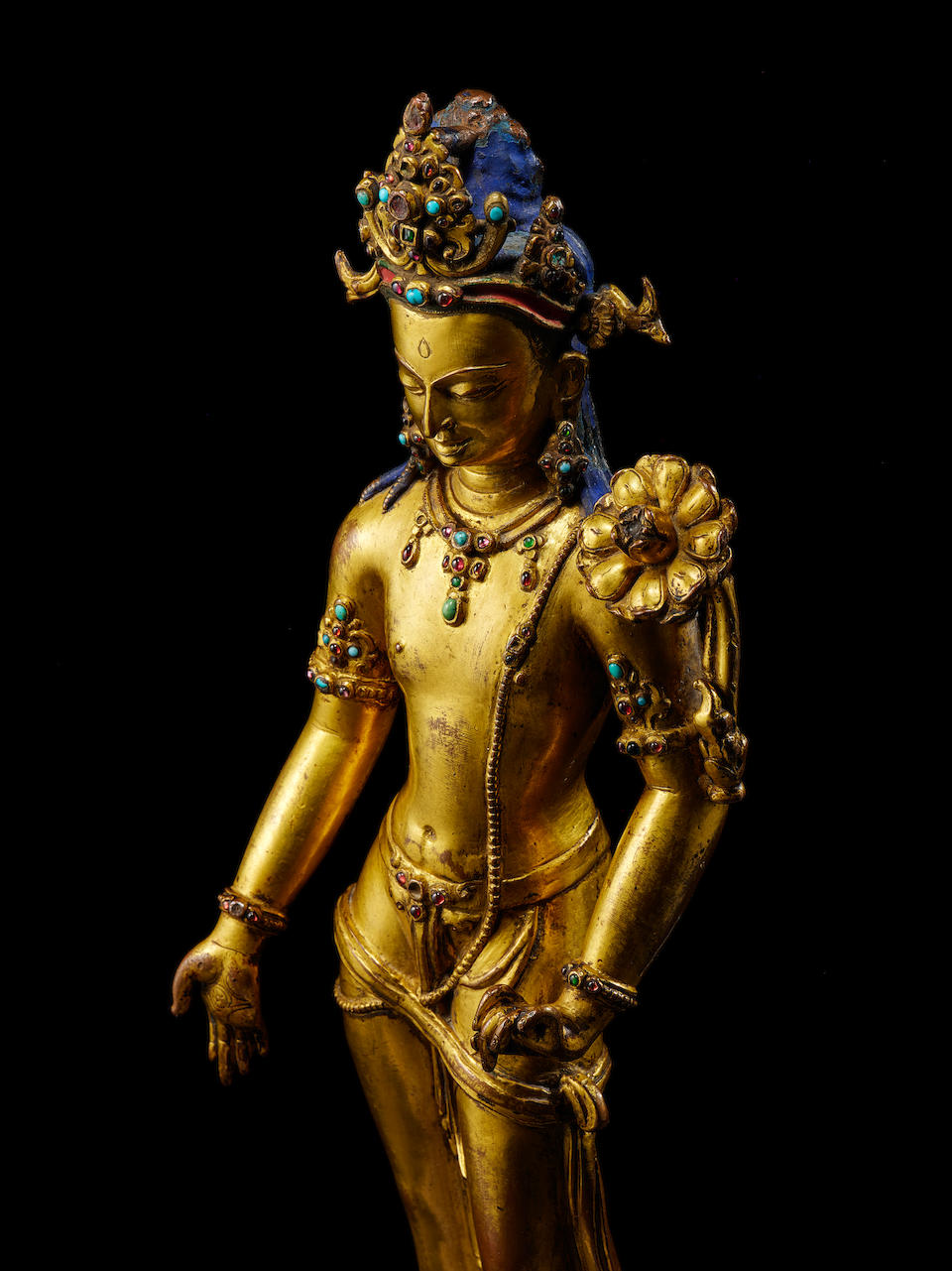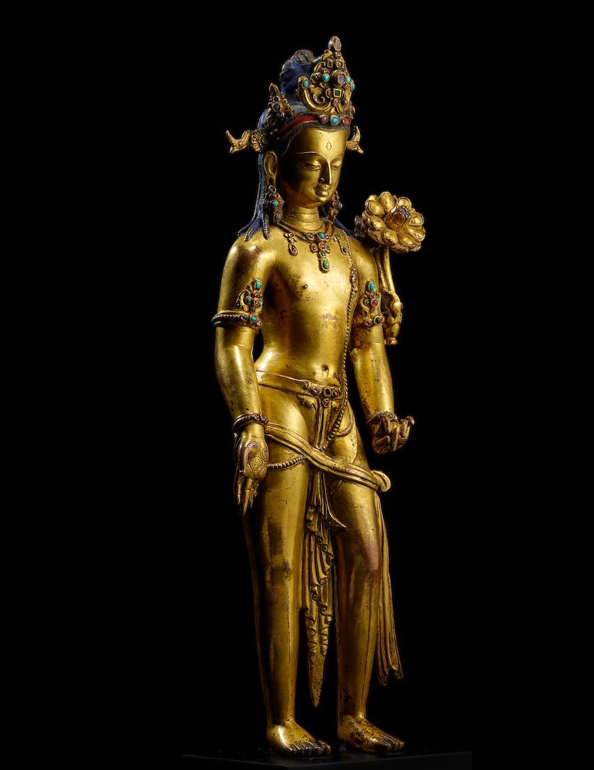 - Note : This lot has an impressive pedigree. Opening his gallery in 1960, Peter Marks (1935-2010) was a leading art dealer in the then-nascent market for Indian, Himalayan & Southeast Asian Art in the United States. Marks sold this lot to Pierre Jourdan-Barry, who handpicked one of the most sophisticated collections of Himalayan art ever formed in the West. The remainder of Jourdan-Barry's collection was acquired by the Rubin Museum of Art, New York, in 2005, and included many of the museum's masterpieces, including the 'Rubin Durga' (see HAR set no.1771). This elegant and impressively gilded sculpture depicts Avalokiteshvara, who is the bodhisattva of compassion and the most widely worshipped of the Mahayana bodhisattvas. Here, at the center of his forehead, the artist has depicted Avalokiteshvara's urna (considered a sign of a great spiritual being) not as the traditional tuft of hair, but as a confidently outlined teardrop gem, visually recalling the tear Avalokiteshvara shed for the universe upon surveying its suffering, and from which the bodhisattva Tara famously manifested to help. This symbolism is recalled by three teardrop pendants around Avalokiteshvara's neck. With the inset gems and turquoise stones against the bodhisattva's radiant skin, the artist draws the viewer's eye down across the sinuous physique he has cast. The eye traces the supple contours of the solar plexus and waist before being ushered by the sacred thread (yajnopavita) descending from the left shoulder over the sensuous sway of the right hip, and finally landing on the right hand which is outstretched in an iconographic gesture that signals Avalokiteshvara's charitable benevolence. Each finger is carefully articulated, and the open palm is incised with a wheel, drawing on an ancient concept of the bodhisattva as a chakravartin (lit. 'wheel-turner'), a ruler who protects and furthers the cosmic Dharma. The left hand would have held a thin piece of wire representing the stem of the lotus which rises and blossoms by his shoulder, affirming any being's ability to realize their innate Buddhahood, which is Avalokiteshvara's mission. The artist's detailed presentation of the flower is a casting tour de force saturated with nuanced symbolism, having plump, succulent petals suggestive of Buddhism's nourishing wisdom, while more nascent inner petals remain unfurled and support a setting for a gem, the fruit of Avalokiteshvara's ongoing work. Depicting Avalokiteshvara in his popular form known as Padmapani Lokeshvara, 'The Lord Who Holds the Lotus', this sculpture is a prime example of the Newari 'standing bodhisattva', which is one of Himalayan art's signature icons. The Newars are an ethnic group from Nepal's Kathmandu Valley renowned for being among the most accomplished artisans in Asia. They were frequently sought after for major artistic projects in Tibet, Mongolia, and China, and produced large, graceful standing bodhisattvas for domestic and Tibetan patrons most numerously between the 10th and 14th centuries. Representing the bodhisattva with an elegant, lightly-clad and bejeweled body accentuated by a sinuous 'thrice-bent' stance (tribhanga), the Newars preserved an artistic tradition established in India during the Gupta period (4th-6th century), regarded as India's cultural Golden Age. The standing bodhisattva's lithe physique and regalia draw on ancient Indic symbolism, which conveys the spiritual being's perfect inner consciousness through an idealized outer physique, cloaked in princely attire to assert his higher, spiritual authority over our worldly, political plane. While the Newars preserved the standing bodhisattva leitmotif from one masterpiece to the next, subtle shifts in detail and emphasis can be charted chronologically, leading to an attribution to the 11th century for this bronze. For example, as with a large, fragmentary standing bodhisattva in the Rubin Museum of Art, New York (C2003.24.1; HAR 65315), the mouth has a noticeably plump bottom lip, which Vajracharya argues is gradually abandoned after the 11th century, while the diamond shape of its earrings in fact appeared over the course of the same century (Vajracharya, Nepalese Seasons, New York, 2016, p.69). The yajnopavita on both the Rubin piece and the present example intersects with the slack sash around the hips in a manner which can be narrowed to the 11th and 12th centuries, neither looping up and over the sash like earlier Newari standing bodhisattvas from the 10th century, nor running parallel to it as is commonly seen in examples from the 13th and 14th centuries and beyond (see Bonhams, Hong Kong, 29 November 2016, lot 111, and the Rubin Museum of Art, New York [C2005.16.8; HAR 65430]; respectively). An 11th-/12th-century Padmapani Lokeshvara in the Metropolitan Museum of Art, New York (1982.220.2) similarly displays the bottom lip and intersecting sacred thread, as well as comparably wispy crown ribbons, foliate belt medallion, and diagonally-oriented sash. By the 13th and 14th centuries, noticeable stylistic differences include changes to the bottom lip and scared thread, as well the replacement of ring-shaped earrings, a less-prominent central crown leaf, more abstracted, slightly swollen thighs, and a general physique cast in a more exaggerated and thus more rigid standing posture, as seen in the later Padmapani Lokeshvara in the Rubin Museum of Art cited above. Therefore, in contrast to other standing bodhisattvas produced before and after, this outstanding Padmapani Lokeshvara benefits from a naturalistic and nuanced pose that more convincingly distributes the weight and balance of the thrice-bent stance. The figure is neither as stiff as more upright earlier examples, nor as exaggerated as later examples typically are—and neither attenuated nor plump. Rather, its portrayal of Avalokiteshvara's well-nourished form, which is a critical component of the idealized body within the Newari aesthetic, is understated and truer 