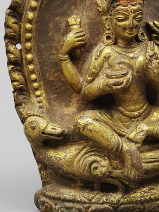 - Footnotes : Seated on goose, Brahmani represents the source (shakti) of the Hindu creator god Brahma's power. She is popularly worshipped in Nepal as part of a group of Mother Goddesses (maitrikas), joining several others in this sale. A similar representation can be seen in the side registers of a Nepalese painting with nine matrikas in The Metropolitan Museum of Art, New York (2018.750). Stylistically, the plaque stems from the Late Malla period (1482–1768 CE), displaying a comparable treatment of its flaming aureole as a 16th-/17th-century repoussé sculpture of Lokeshvara in the Rubin Museum of Art, New York (C2003.46.2; HAR 65289). A pair of very similar plaques, formerly in The Virginia House Museum, Richmond, were offered by Christie's, New York, 11 September 2019, lot 369. Two further related plaques of Ganesha from the same period are published in Neven, Etudes d'art lamaïque et de l'Himalaya, Brussels, 1978, nos.149 & 150. Another is in the Art Institute of Chicago (2008.701), attributed to the 16th/17th century.