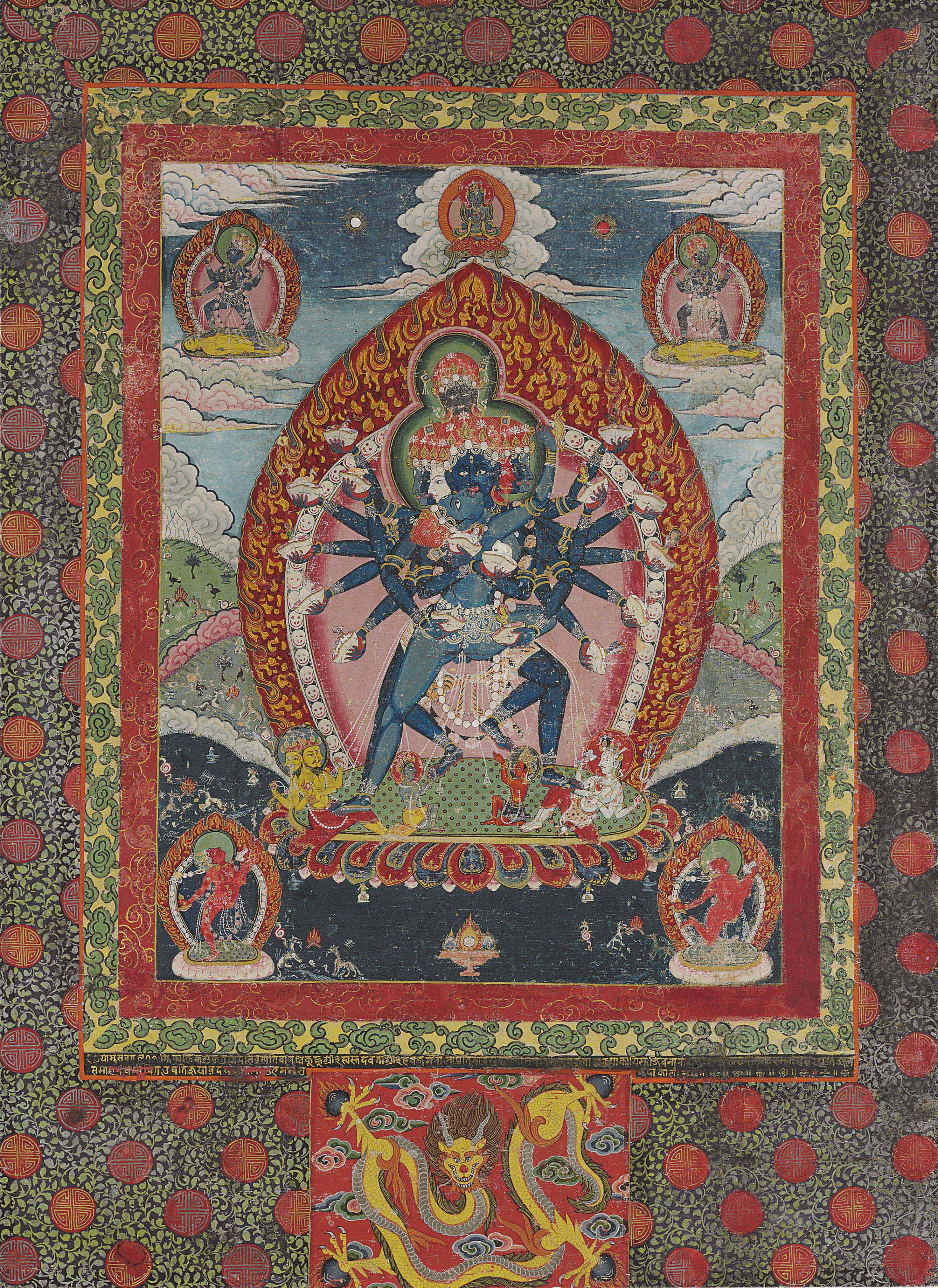 The two deities locked in embrace at center, she holding a skull cup aloft and dressed in beaded festoons, the face with the third eye gazing into his, he held a multitude of skull cups and dressed in a tiger skin, the various faces in different colours, standing on Brahma at left and Shiva at right, backed by an aureole of skulls and flames, with two forms of Vajrayogini below and Vajradhara flanked by two retinue figures above, all within a landscape populated with animals and with both lingam and stupas