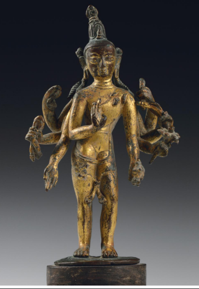 - NOTE : This charming gilt-bronze depicts the bodhisattva Amoghapasha Avalokiteshvara in a similar iconographical form to another in the Sabavala Collection, lot 96, with eight arms and all his hand-held attributes, the rosary and vajra noose in the right hands, and the manuscript, trident, lotus flower and water pot in the left, and standing in an elegant tribangha posture. This example is distinguished, however, by the lack of bodhisattva ornaments. There is no jewelled crown, nor bracelets and necklaces that traditionally adorn a bodhisattva, as seen in the other Amoghapasha in the collection. Instead he is portrayed as an ascetic wearing a flayed antelope skin over his left shoulder and a tiger skin loincloth, with the legs of the tiger tied as a falling sash at the knee and the tiger's head resting on the deity's right thigh. A diminutive figure of Amitabha Buddha, the bodhisattva's spiritual progenitor, is seated in the matted hair that is drawn up in long plaits with a jewel surmounting the tall jatamakuta. He wears flowers above the ears. This unusual iconography, reminiscent of the ascetic forms of Shiva, has an antecedent however in the 8th or 9th century Nepalese Nyingjei Lam Amoghapasha, who also wears an antelope skin over the shoulder and with no jewellery whatsoever, see David Weldon and Jane Casey Singer, The Sculptural Heritage of Tibet: Buddhist Art in the Nyingjei Lam Collection, London, 1999, p. 51, pl. 9.