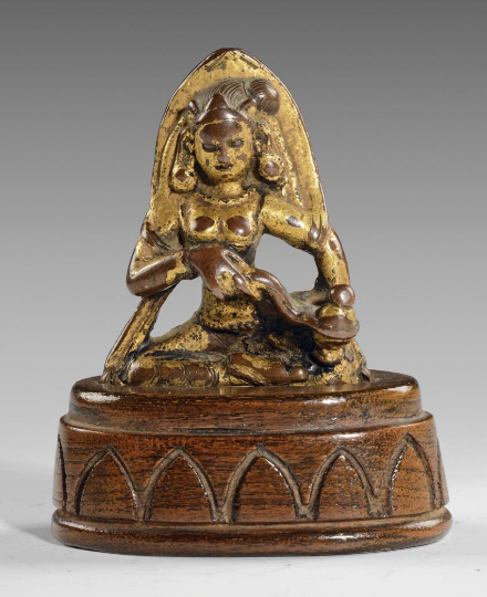 - NOTE : The rich gilding and warm copper tone of this rare sculpture suggests a Newar hand. Compare with the low three-leaf crown and elegant posture of a 9th century Nepalese Jambhala in the Potala Collection, Lhasa, see Ulrich von Schroeder, Buddhist Sculptures in Tibet, Hong Kong, 2001, Vol. I, p. 492, pls. 157A-B. The hair gathered into a large bun features throughout early Himalayan and North Indian female sculpture, such as 10th century Nepalese Buddhist or Brahmanical gilt-copper attendant deities in the Jokhang Collection, Lhasa, ibid, p. 482, pls. 152A-C.