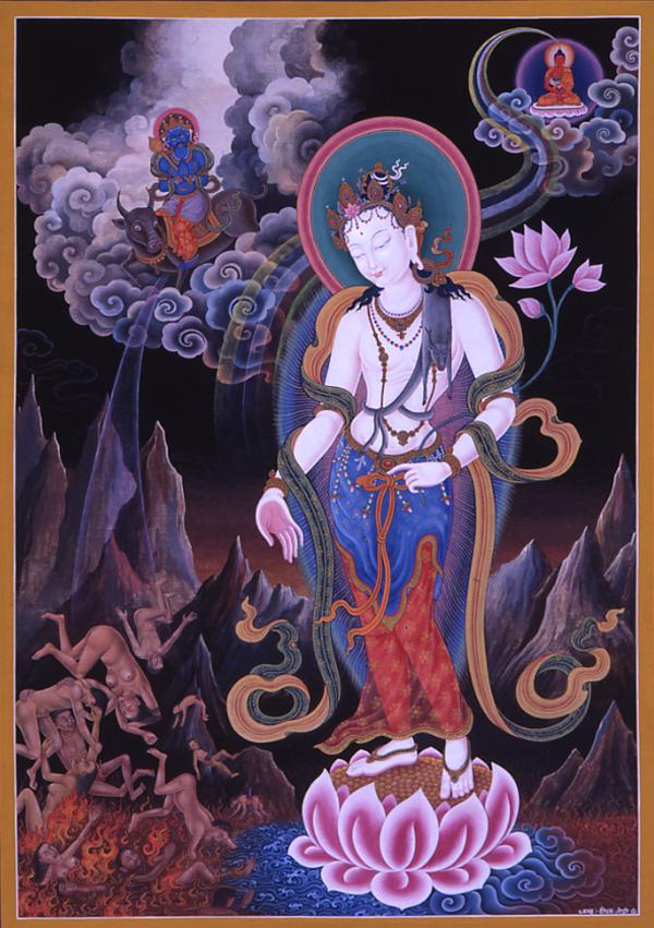This painting depicts a scene in hell. the hell is ruled by Yama who rides a buffalo. Aryavalokitesvara appears and tries to save the souls which have fallen to the hell. While the blazing sea of fire and sharp rocks excruciate the fallen souls, cool water richly ripples under Aryavalokitesvara’s feet. On the top right we see Amitabha Tathagata, which tell us that Amitabha Tathagata is borrowing the form of Avalokitesvara. The artist has achieved in creating a dramatic effect in representing Buddhist teachings.
