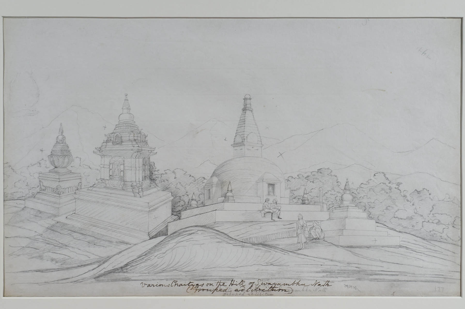 Inscribed: Various Chaityas on the Hill of Swayambhu Nath (Grouped ad libitum). No 3.Watermark dates the paper to 1841.From the collection of Brian Houghton Hodgson.