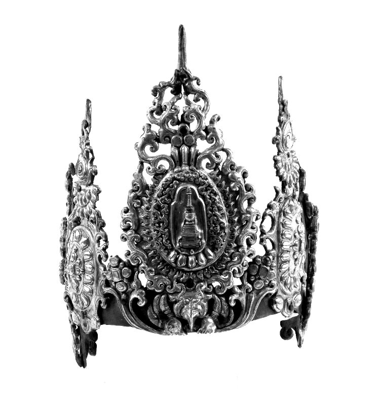 Crown with three pinnacles made of floral scrolls with a central medallion on the front carrying a stūpa; made of gilded and silvered bronze.