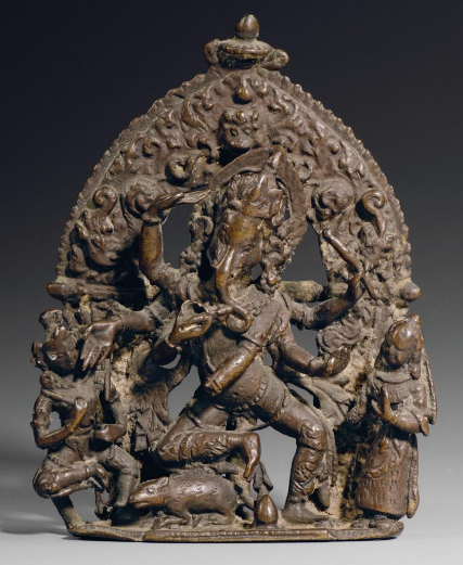 - NOTE : Lord Ganesha in his six-armed form raises his right leg in a lively dance. He is flanked by two consorts or attendants, one with her right foot also raised in dance. Ganesha's vahana, the rat stands at his Lord's feet, with a plump mango at his side. Ganesha is surrounded by an ornate torana with swirling foliate design inset with makaras, each with raised trunks. The torana is surmounted by a kirtimukha and miniature parasol. It is probable that the current bronze formed the finial to an oil lamp, for a similar fitting, see Dr. Pratapaditya Pal, Art of Nepal, Los Angeles, 1985, p. 124, cat. no. S50.