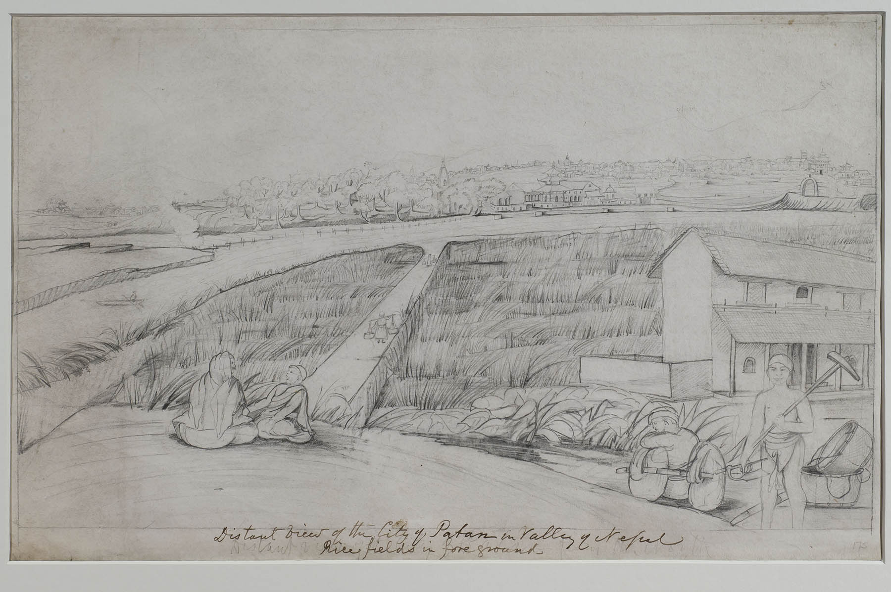 Inscribed: Distant View of the City of Patan in Valley of Nepal Rice Fields in the foreground. No 1.From the collection of Brian Houghton Hodgson.