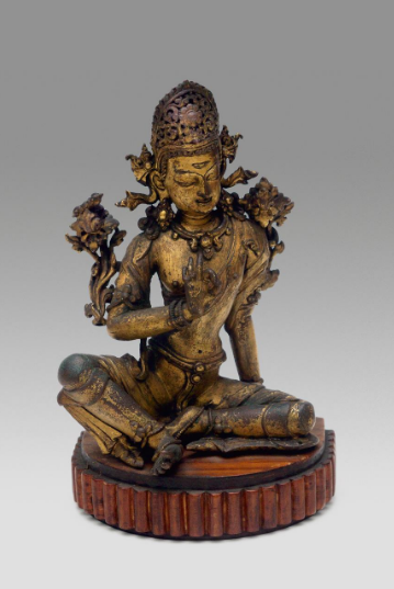 - NOTE : The present work depicts Indra, who according to Buddhist thought is regarded as King of the Gods. Indra is seated in rajalilasana, the posture of royal ease, wearing regal attire, adorned with a magnificent crown and ornamented with jewels. His right hand is raised in vitarka mudra, the gesture of teaching, whilst his principle emblem, the vajra, is supported by a flower at his right shoulder. His characteristic horizontal third eye is finely incised on his forehead beneath a tall foliate crown. As Dr. Pratapaditya Pal notes, this representation of Indra seated in rajalilasana and displaying vitarka mudra is indigenously Nepalese and can be regarded as a local innovation. Compare the present work to a 16th Century Nepalese prototype of this bodhisattva from the Nasli and Alice Heeramaneck Collection, see Pratapaditya Pal, Art of Nepal, Los Angeles, 1985, p. 119, pl. 50. Indra was often depicted in tandem with his consort, Indrani, see lot 28. For another example see Sotheby's New York, December 1, 2003, lot 25.