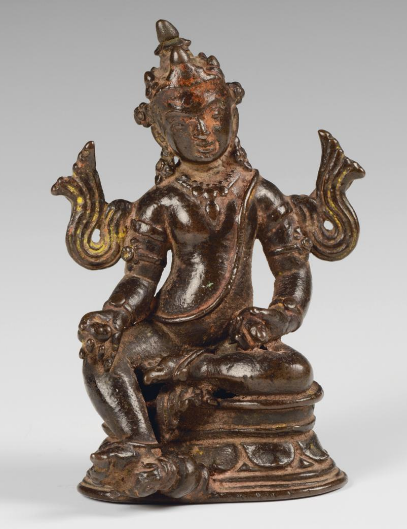 - NOTE : Yellow Jambhala is seated in lalitasana on a lotus pedestal. He holds a mongoose in his left hand and a fruit in his right. He is adorned with heavy bracelets, anklets and a broad bejewelled necklace, his head surmounted by a foliate crown, his right foot resting on a treasure. Konchog Lhundrub (1497 - 1557) outlines the iconography of the Yellow Jambhala in the One Hundred Methods of Accomplishment, stating 'Yellow Jambhala with one face and two hands. The right hand holds a bijapuraka [fruit] and the left a mongoose with jewels showering down. Two feet pressing down on a conch and lotus treasure. [He is] adorned with a blue utpala garland and jeweled ornaments.' (www.himalayanart.org) Yellow Jambhala wears ornaments similar to that of a bodhisattva. The iconography follows that of Yaksha figures in Indian art, and is similar to the appearance of the Four Guardian Kings in Tibetan art. Jambhala is worshipped as a wealth deity and rituals and meditations are done for the purpose of acquiring wealth. One ritual in particular, requires a physical representation, in the form of a small sculpture. The ritual involves pouring 108 offerings of water over the head of Jambhala, whilst reciting a short mantra.