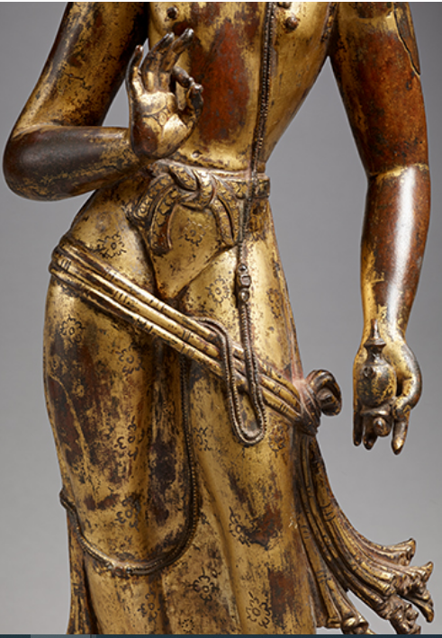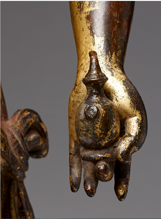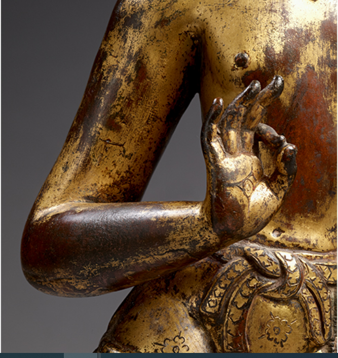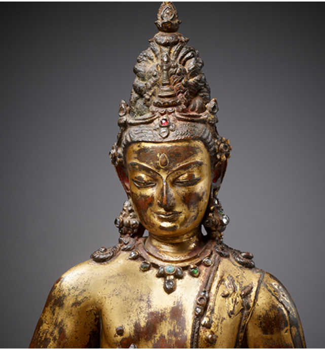This classical Nepalese figure, produced by Newar artists from the Kathmandu Valley, shows Maitreya, the future Buddha, spreading the light of wisdom and placing the believer on the path to enlightenment. While light, represented here by gold, did not give rise to major theological developments in Buddhism, the Mahayana school of the Great Vehicle taught that divinities known as Bodhisattva have the power to save living beings by leading them to the final enlightenment (Bodhi). This imagery of light is reflected in the names of some of these divinities, including the celestial buddhas Vairocana, the Enlightener, and Amitabha, Immeasurable Light.