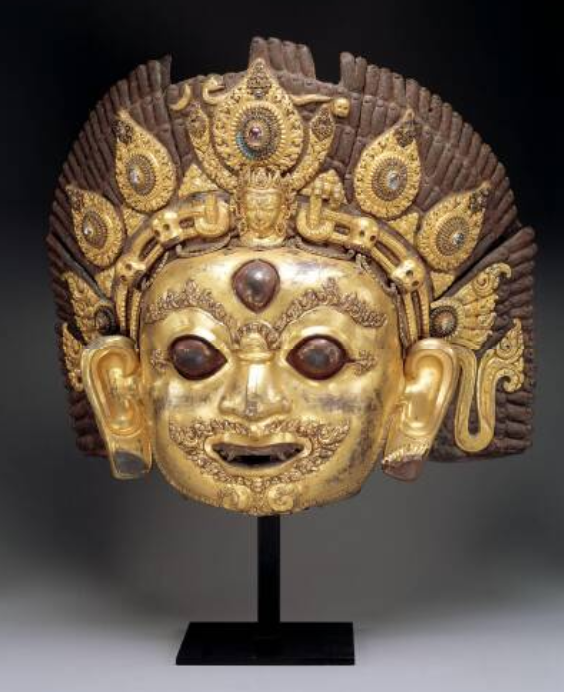 This mask of the ferocious Hindu god Bhairava was created by Newari artists in Nepal. Bhairava is a popular divinity in the Newar community. He also appears as a full figure in the Bhairava collar necklace [1987.470]. Bhairava is the wrathful aspect of Shiva, the warrior king of the gods. To a devotee, he is the master and creator of the universe, the Supreme Being (Ishvara) who protects from all dangers in this and future lives.