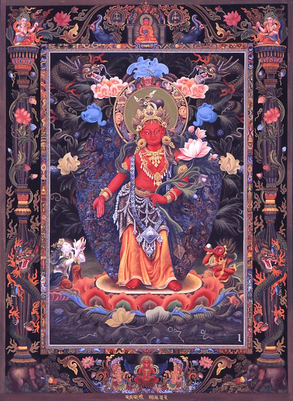 This painting is based on works of Anandamuni Shakya, who is said to be the first artist to have adapted the Western realistic expression to Paubha paintings. While Anandamuni painted in monochrome, Mahendra Dongol used bright colors against black background. Moreover, while Anandamuni did not decorate the halo, Mahendra added small decorations to it. The large necklace reaching the knee and the earrings are accessories peculiar to the Newari people. By incorporating new elements to existing works, Paubha artists often create their unique style as shown in this work.