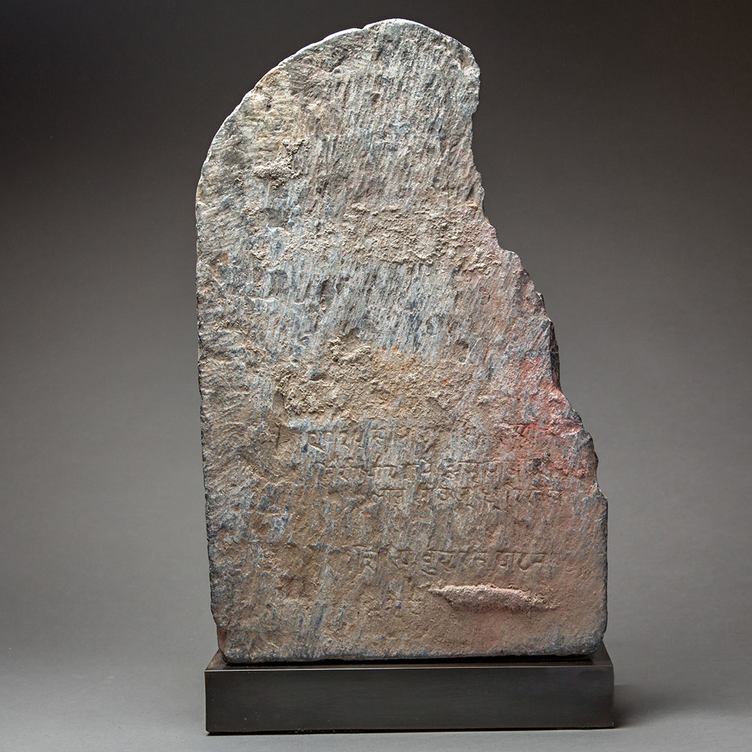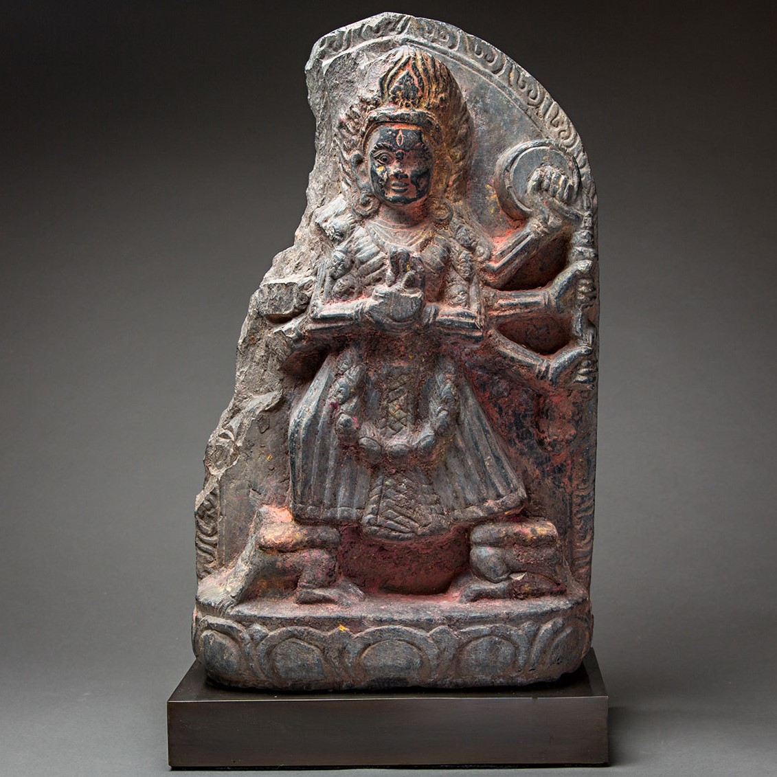 - Footnotes : This beautiful sculpture depicts Kaal Bhairav, the Lord of Destruction and an incarnation of the Hindu god Shiva. According to one legend Brahma and Vishnu were disputing who had the right to be worshipped as supreme creator of the universe. When Brahma claimed this title for himself, Shiva became angry and created Bhairav to punish Brahma for his arrogance. Having cut off one of Brahma’s five heads, Bhairav was forced to carry it around as a reminder of his sin. Despite the damage to the left side of the piece it is still possible to make out some of Bhairav’s attributes, including the skull cap that he holds in front of his chest. Kaal Bhairav is especially popular in Nepal and his image is placed before temples and paraded through the streets during the festival of Indra Jahra. It is believed that his statue acts as a lie detector and people suspected of committing a crime were often brought before him to elicit a confession. It was thought that if they lied they would immediately bleed to death. The large garland draped around his neck and beneath his belly is adorned with skulls, a common attribute that sometimes also appears in his headdress. Writhing snakes, or nagas, adorn his earlobes and add to the ferocity of his appearance. Traces of red and orange powder, which was added to the sculpture by pious devotees remind us of the awe and respect that this deity once inspired.