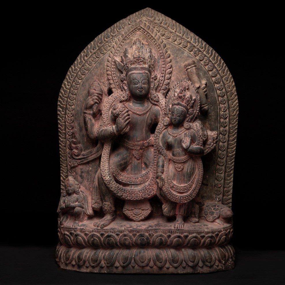 - Footnotes : The arched stele finely carved in relief depicting the Hindu god Vishnu form seated with his consort Lakshmi on his knee upon a lotus pedestal, accompanied by the kneeling Garuda on his right and Kurma on his left. Vishnu’s four arms radiate around him holding various attributes, his consort’s left hand raised in abhaya mudra and right hand lowered in varada mudra, both jewelled and wearing long floral garlands. Each deity is surrounded by a pearl-and-flame aureole, as is the entire ensemble. Regarded as the Preserver of the Universe, Vishnu is one of the most important gods in the Hindu pantheon. In the center of the symmetrical and hierarchical composition, Vishnu holds four attributes in his four hands: a club (gada) representing his power in his upper left hand; a lotus (padma) that alludes to rebirth in his lower right; a now broken wheel (cakra) for enlightenment in his lower left; and a conch (sankha) representing life-giving water in his upper right. The stone panel preserves a notable stint of red. Red, a sign of both sensuality and purity in Hinduism, is the hue used for important occasions, such as weddings, births and festivals. During prayer, red powder is tossed upon sacred statues, and deities who are brave are often shown wearing red. Therefore, it suggests that this stone panel was socially functional, situated in religious sites and temples. This practice is still alive today in Nepal and India, among other regions. – (HK.2002)
