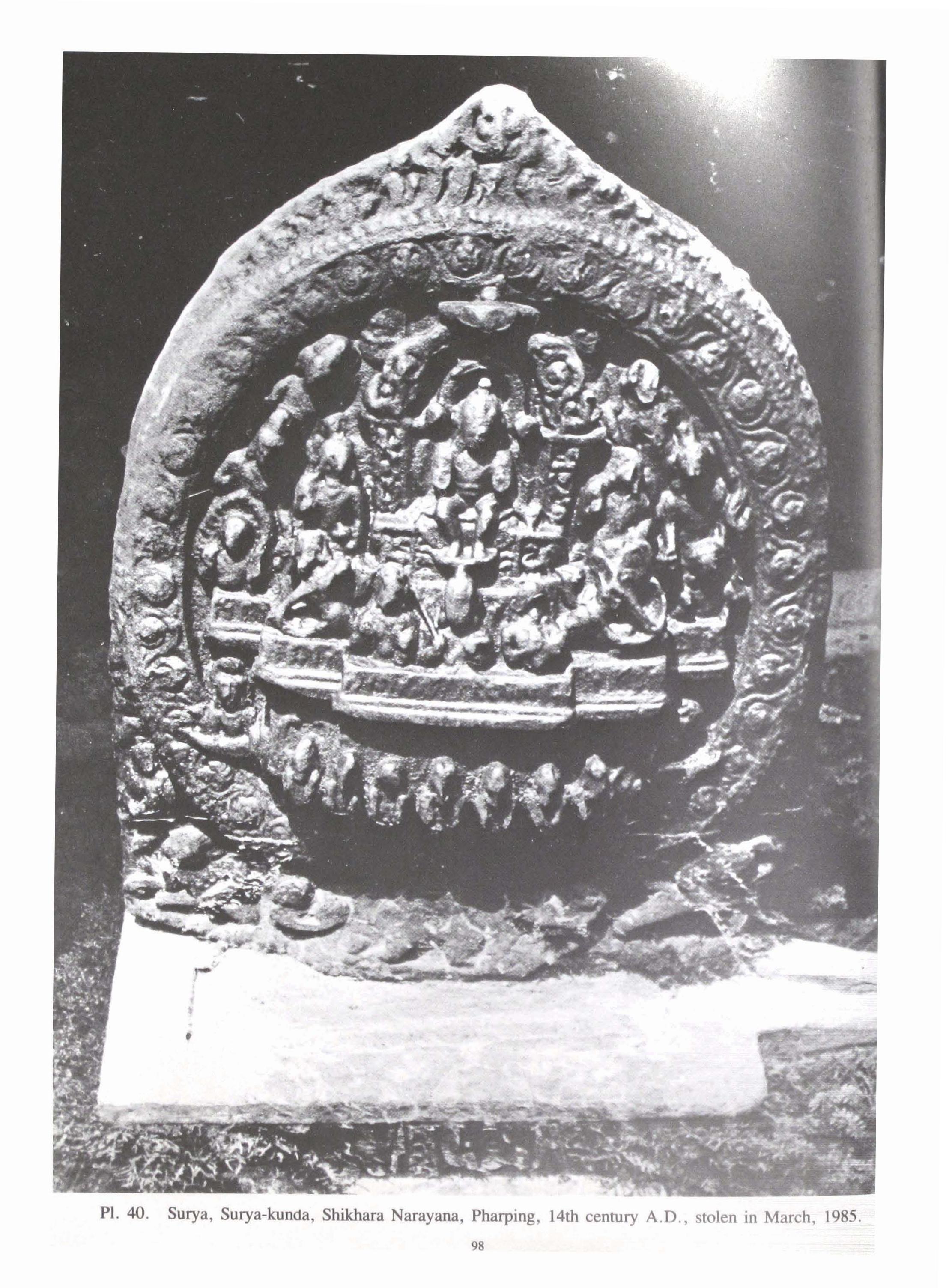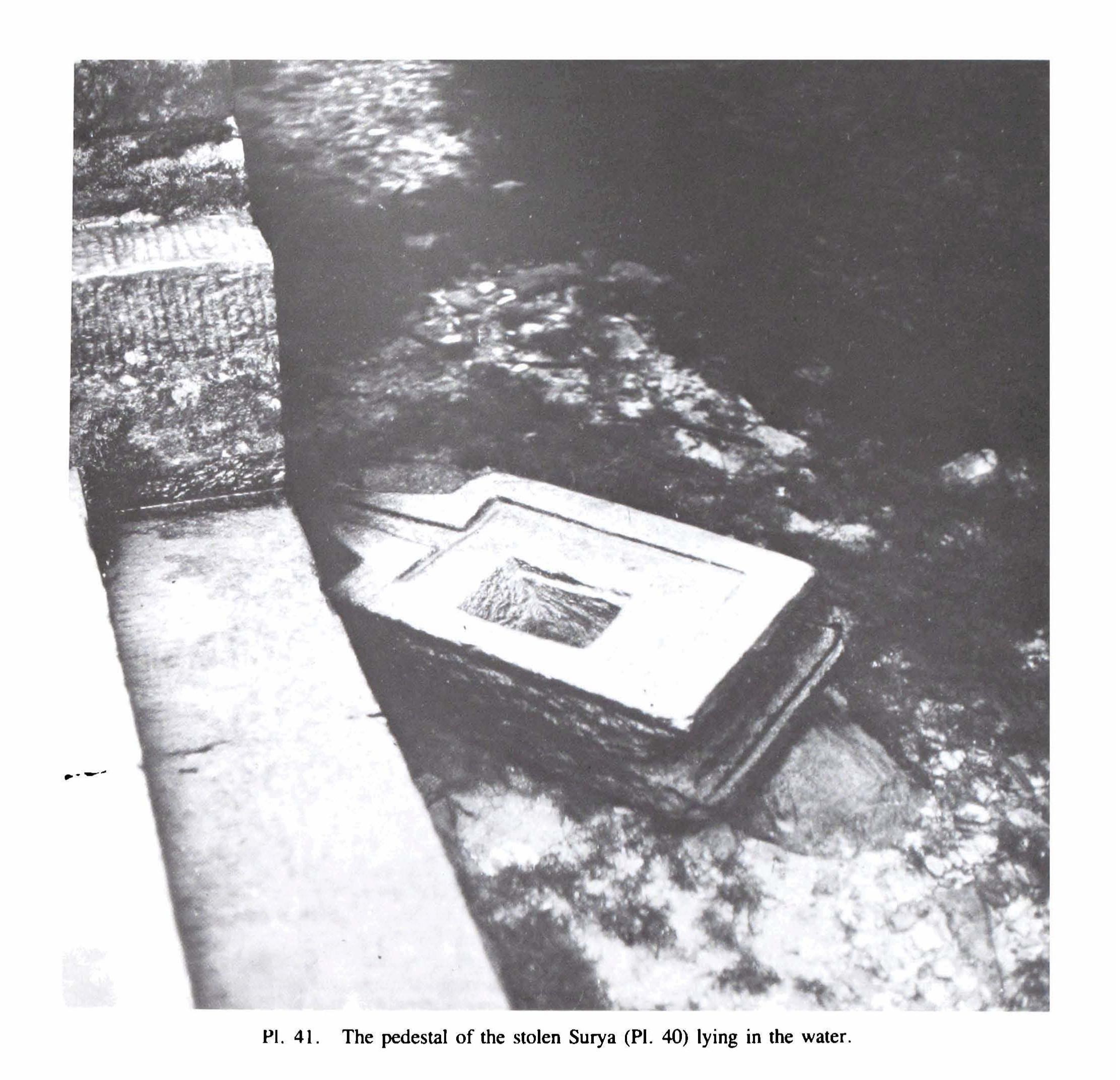 In the early Nepalese representation, Surya was shown standing or sitting alone, and in some cases he was represented sitting on a chariot drawn by seven horses with Aruna as charioteer. In both versions he was shown wearing either dhoti or northern dress which can be traced back to 1rani;ln influence. One such Surya image was found at Suryakunda at Shikhara Narayana in Pharping (PI. 40). The base of the relief was submerged in water, but the entire relief was fairly visible. In this circular relief Surya, the Sun-god, was delineated seated under a canopy on a decorated throne occupying the central position. He was flanked by other divinities whose identification was difficult to establish, owing to the abrasion of the relief. Aruna, the charioteer, driving the seven horses, was sitting in front of Surya. This charming sculpture was stolen in March, 1985. Only the rectangular base of the image was left behind as seen in the photograph (PI. 41).