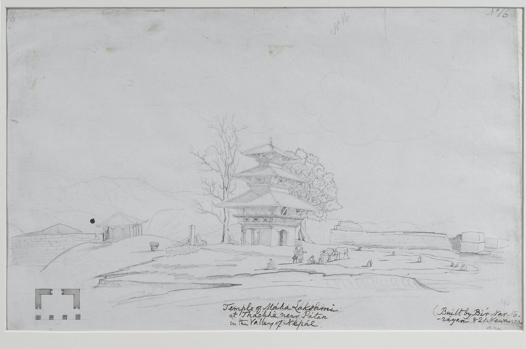 Inscribed: Temple of Maha Lakshmi at Thache near Patan in the Valley of Nepal (Built by Bir Nar Narayan 821 Newar era). No 16.From the collection of Brian Houghton Hodgson.