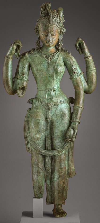 - CURATOR NOTES : One of the earliest of its type known from Nepal, this jeweled representation of the god Siva and his consort Uma depicts them as one being, Ardhanarisvara, the Lord Whose Half Is Woman. The concept of the androgynous image uniting Siva and Uma was devised by theologians to emphasize the nonduality of the divine principle uniting masculinity and femininity. The fact that such images were conceived in a male-dominated civilization reveals the great importance of the feminine principle in Hindu religious thought. The gods of the Hindu pantheon are considered to be timeless and unaging beings. They are often represented with a lithe, feminine grace, which permitted the artist to join this figure's distinctly male and female halves with minimal disorientation. Uma has a wide hip and prominent breast; Siva is more angular, his waist less sharply curved. His knee-length roman dips gracefully downward to become Uma's ankle-length garment. His matted locks are piled high in contrast to Uma's elegant coiffure. Balancing these carefully delineated distinctions, the three surviving arms have similar slender, rounded shapes. A strong vertical ellipse, described by the shoulders, lowered arm, and the sash slung across the lower legs, unites the composition. A second ellipse, suggested by the two raised arms, with its apex at the brow, overlaps and encompasses the first. These circumferences reveal themselves slowly, encouraging an unhurried meditation on the smooth, curved forms and reinforcing the sense of cosmic unity the image is intended to convey. Its sense of calm and balance shows the influence of Indian Gupta art.