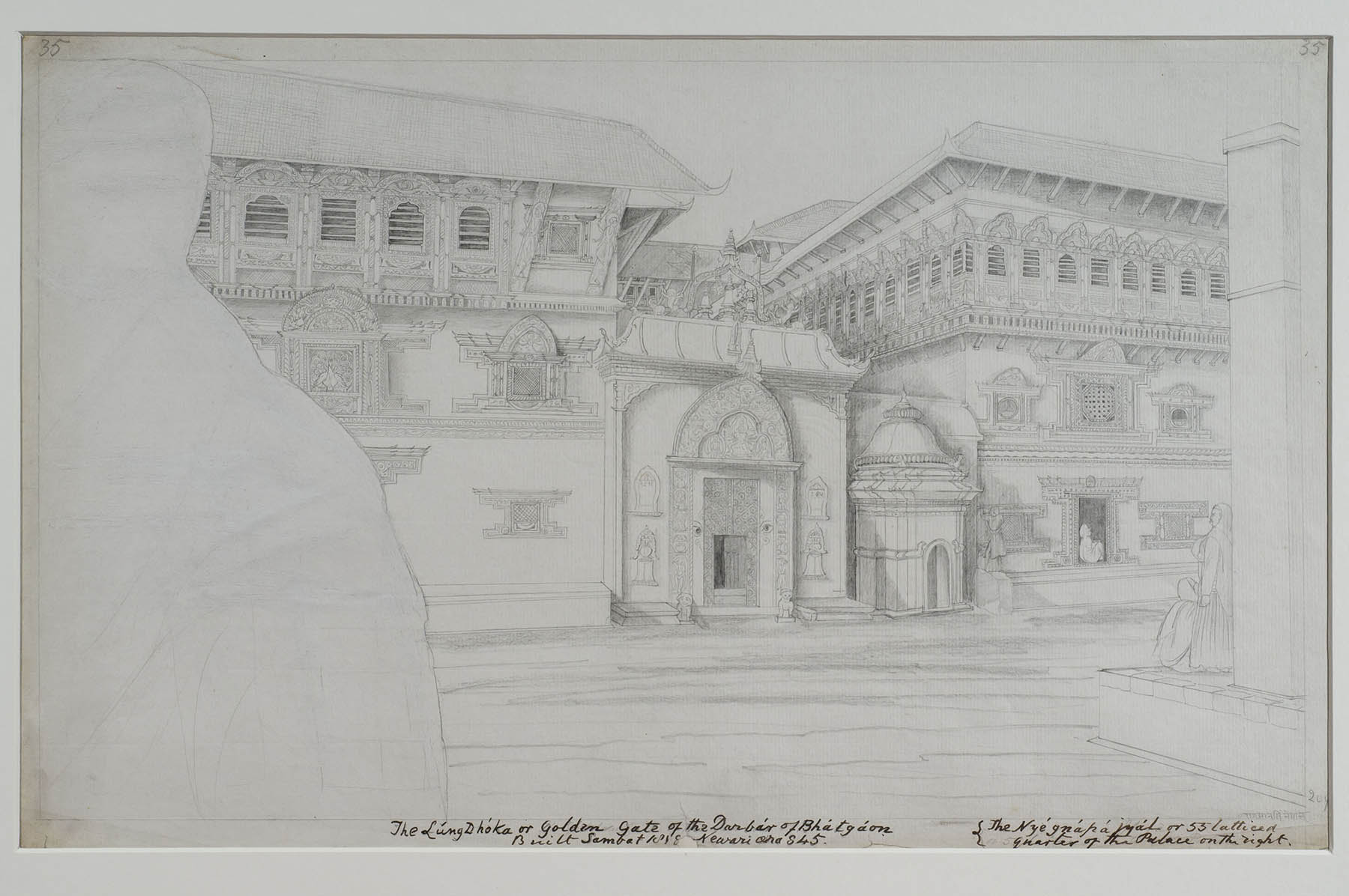Inscribed: The Lung Dhoka or Golden Gate of the Darber of Bhatgaon. Built Sambat 1818 Newari era 845. The Nye gnapa jual or 55 latticed quarter of the Palace on the right. No 35.Signed: Raj Man Singh from the collection of Brian Houghton Hodgson.
