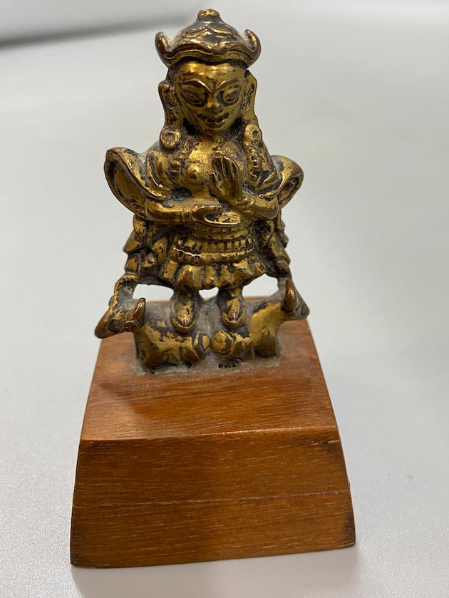 Including a gilt copper figure of a goddess (plaque fragment), possibly depicting Maheshvari standing above two recumbent bull (Nandi) vehicles, Nepal or Western Himalayas, and a gilt copper nimbus for a Naga buddha, the five naga mounted under a makara head centered above a flame shaped nimbus set with paired bulls under a galleried two-prong base.
