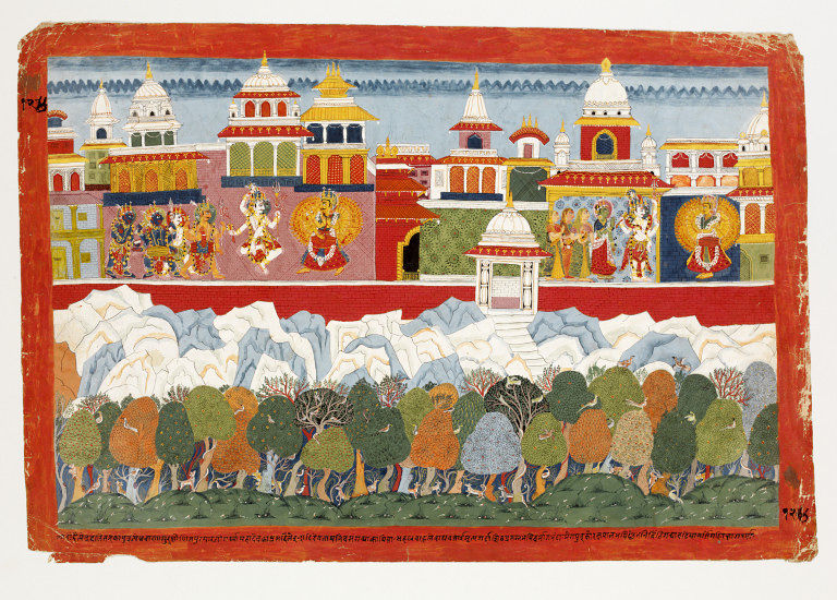 Painting, in opaque watercolour on paper, illustration to the Bhagavata Purana, the one-thousand armed demon Vanasura visits Shiva and Parvati on Mount Kailash. He presents himself (right side of upper panel) and then accompanies Shiva who dances before him in ecstacy.