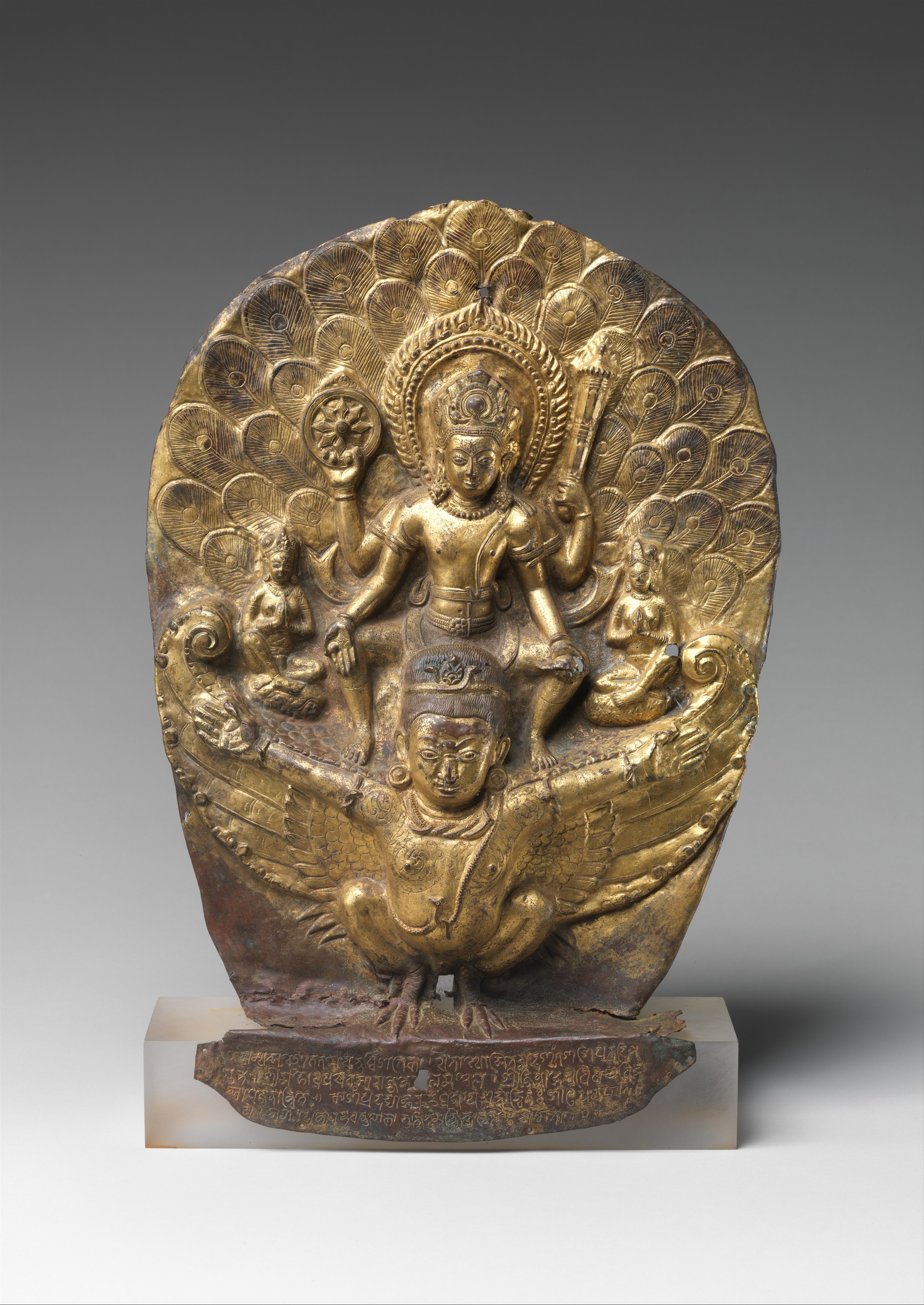 This rare early example of Nepalese repoussé depicts the god Vishnu in flight astride his half-bird, half-human mount, Garuda. He displays a flaming discus, a club, and a conch. Atop his wings are diminutive figures of his wives. Vishnu was the premier deity of the North Indian Gupta clan, and Garuda their dynastic symbol—a royal association that continued with the Licchavi kingdom in Nepal. The inscription here refers to Vishnu Garudadhvaja (One Whose Banner is Garuda), the Gupta symbol. This relief, the oldest known example outside Nepal, served as a protective sheath for a stone icon of the same subject.
